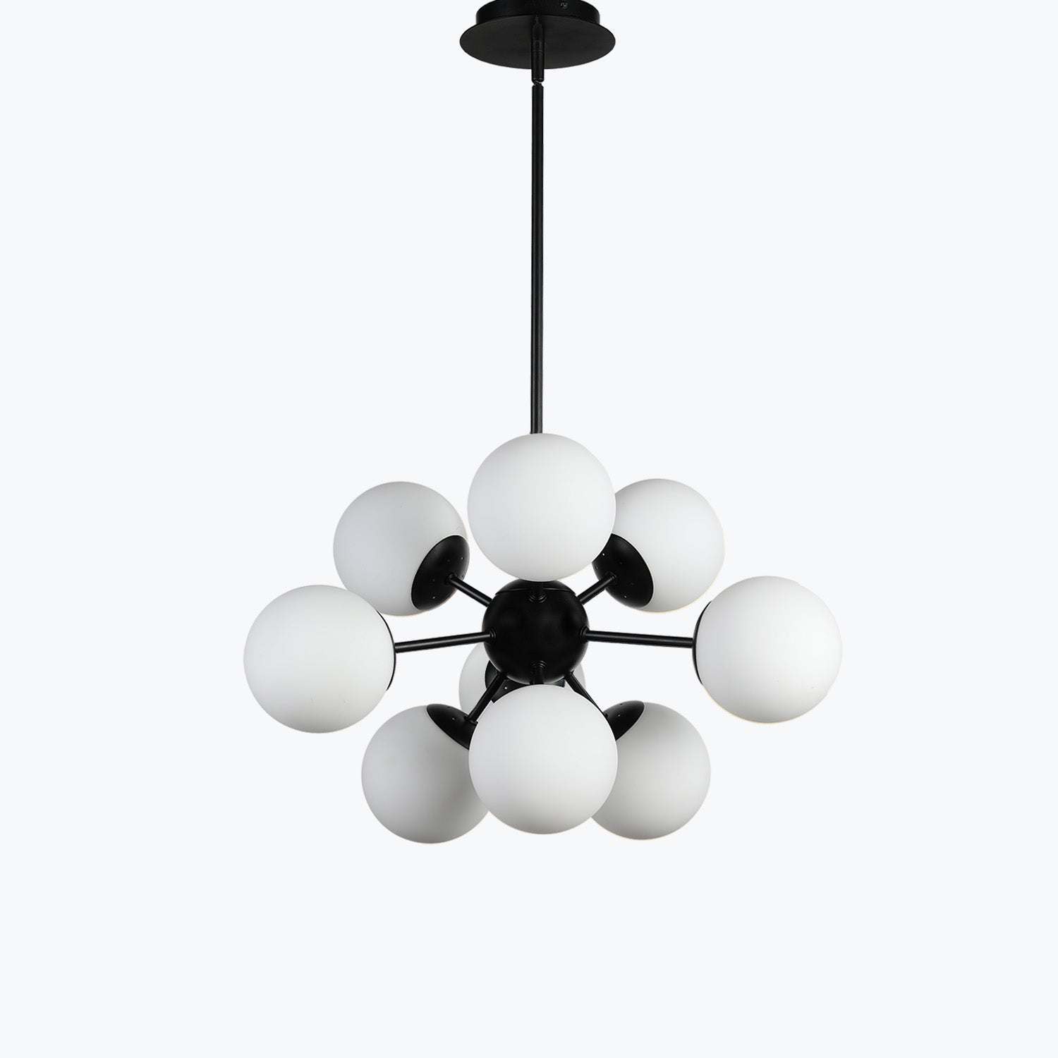 Introducing the JM Limited Edition Design, a Collection by Joshua Marshal. Prepare to be mesmerized at first sight by this exquisite Pendant Chandelier. 9 Sputnik Arms with White Globes fly in different directions in this modern twist of a classic Globe Pendant. Adorned in a luxurious Matte Black finish, this fixture is mounted on a sturdy pole down rod, multiple lengths are included, use some or all. Additional down rods are avaiable. Can be mounted on a flat or slanted ceiling, using the included adjustable elbow attached to the ceiling canopy. Featuring Nine Lights (not included) this Pendant measures 20.5" in width and 16" in Height, the height is adjustable up to 50" tall with the included down rods. Compatible with all bulb types, including LED. Dimmable. Embrace designer trends of lighting with the JM Limited Edition Sputnik Design From the Joshua Marshal Collection, where enchanting illumination meets exquisite design, crafting an unforgettable centerpiece for your cherished spaces.