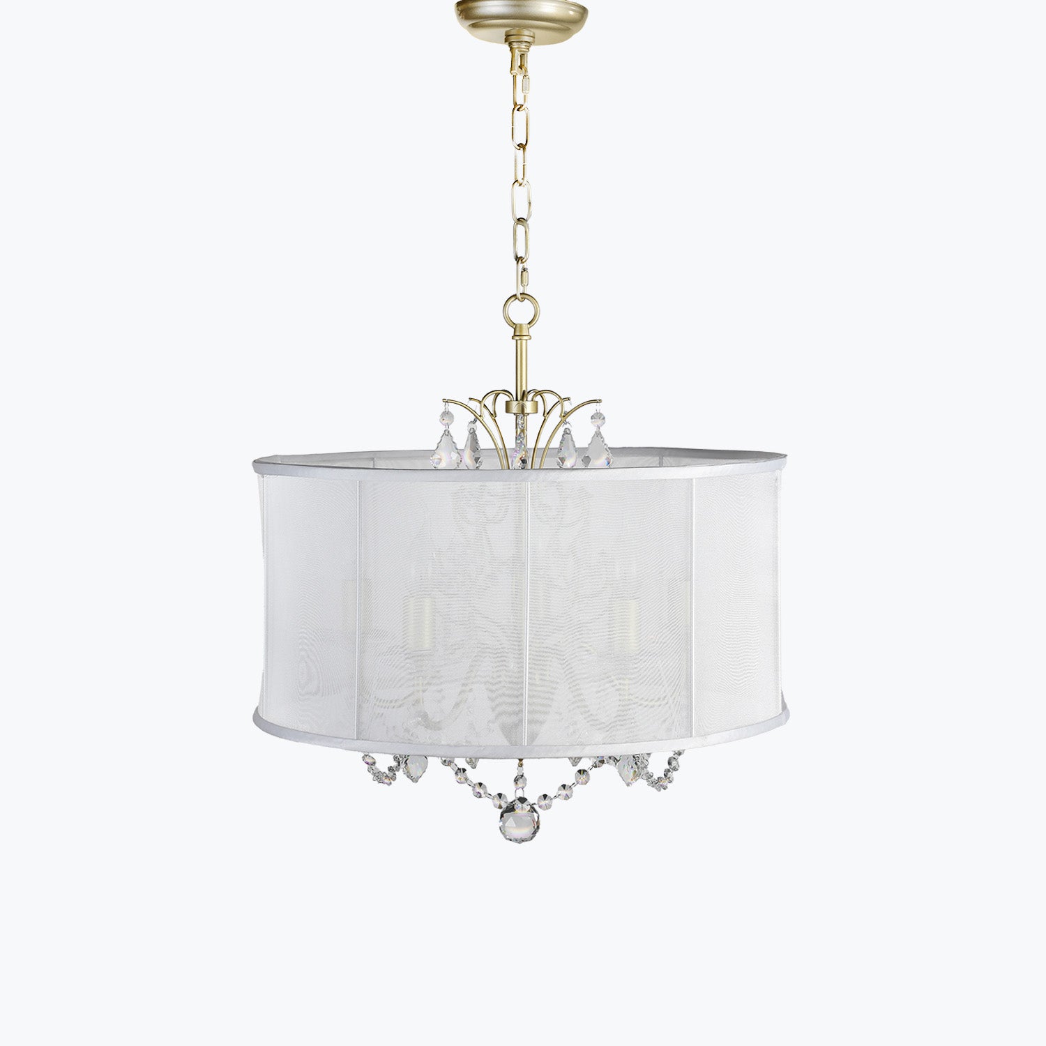 Introducing the JM Shaded Light Design, a Collection by Joshua Marshal. Prepare to be mesmerized at first sight by this exquisite pendant Drum Silk Shade Chandelier. The White Silk Shade Softens The Light While The Clear Hand Cut Crystals Add Elegance to Any Space. Adorned in a luxurious Satin Gold finish, this fixture is mounted on a chain and the overall height can be adjusted up to 93" tall. Can be mounted on a flat or slanted ceiling. Featuring Five Lights (not included) strategically positioned to amplify the brilliance of the design, this Pendant measures 20" in width and 19" in Height. Compatible with all bulb types, including LED. Dimmable. Embrace designer trends of lighting with the JM Shaded Light Design From the Joshua Marshal Collection, where enchanting illumination meets exquisite design, crafting an unforgettable centerpiece for your cherished spaces.