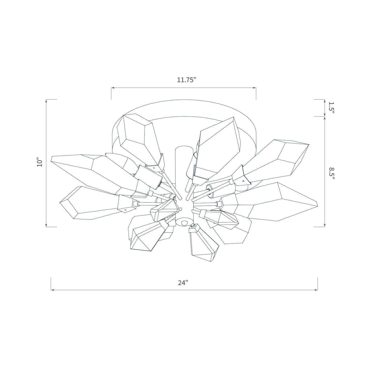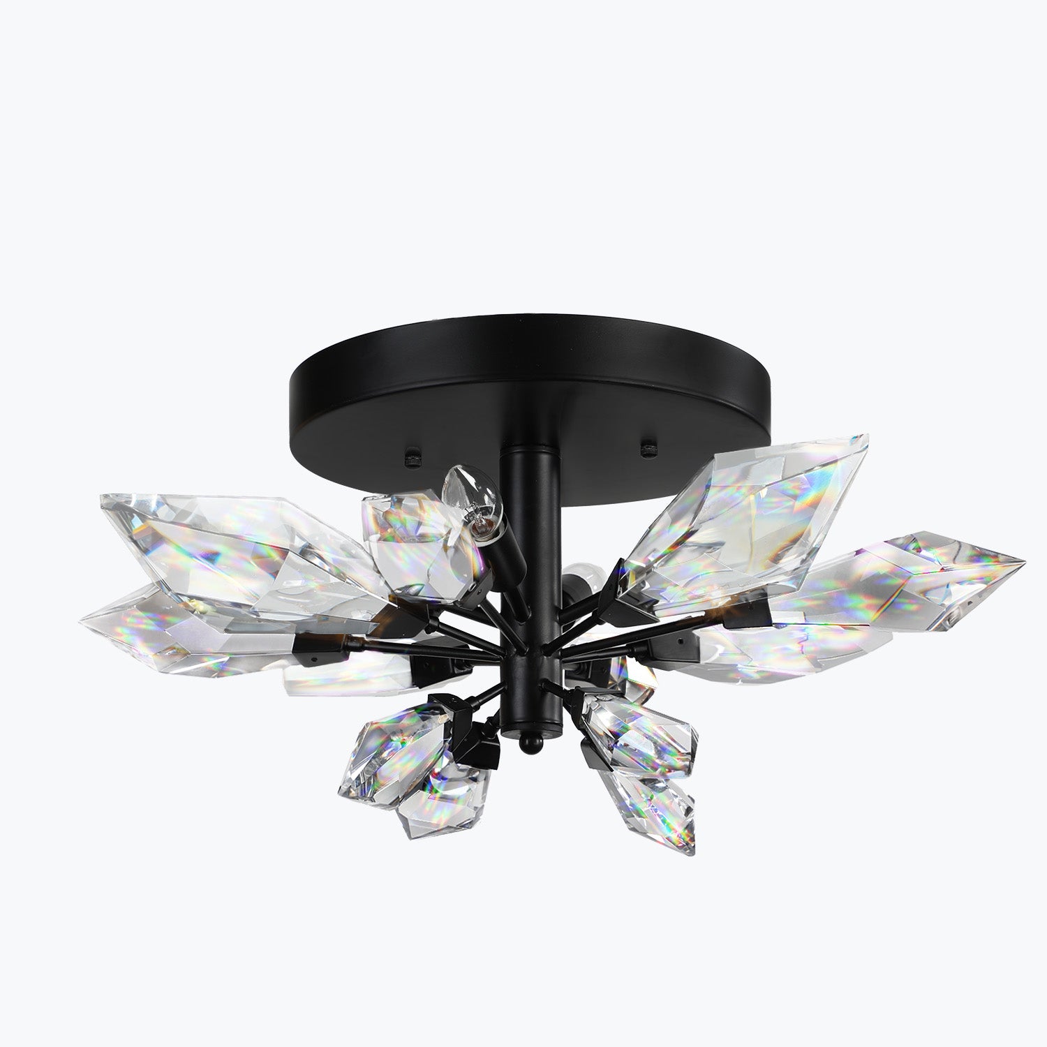 Introducing the JM Crystal Spear Design, a Collection by Joshua Marshal. Prepare to be mesmerized at first sight by this exquisite light fixture. Radiant rainbows dance from the meticulously cut angles of each handcrafted crystal. Adorned in a luxurious Matte Black finish with dazzling Spear Shaped Crystal blocks, this fixture is mounted on a sturdy frame designed to showcase its oversized crystals flawlessly. Featuring four bulbs (not included) strategically positioned to amplify the brilliance of the crystals, this flush ceiling mounted beauty measures 24" in width and a height of 10". Compatible with all bulb types, including LED. Dimmable. Embrace the allure of lighting with the Crystal Spear Design from the Joshua Marshal Collection, where enchanting illumination meets exquisite design, crafting an unforgettable centerpiece for your cherished spaces.